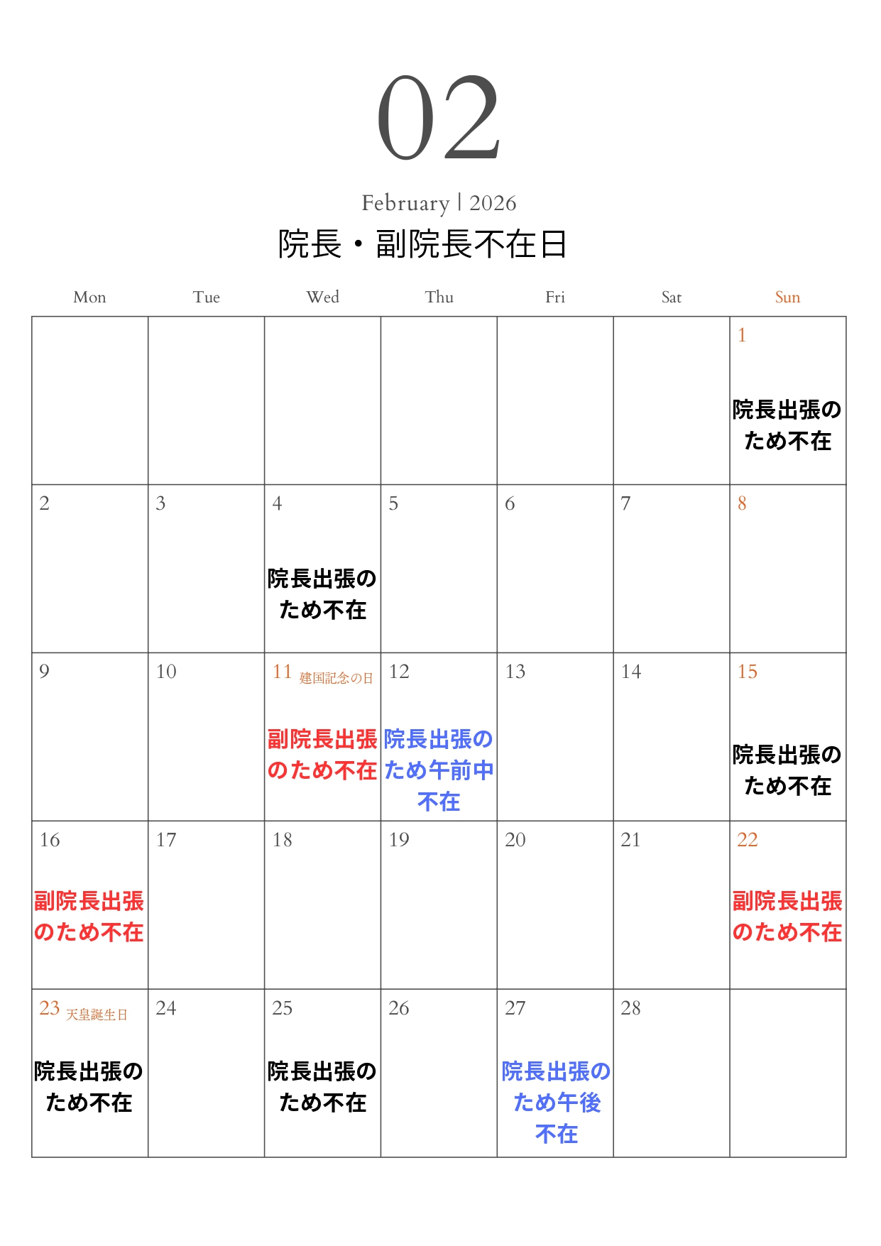 2月の院長・副院長不在日